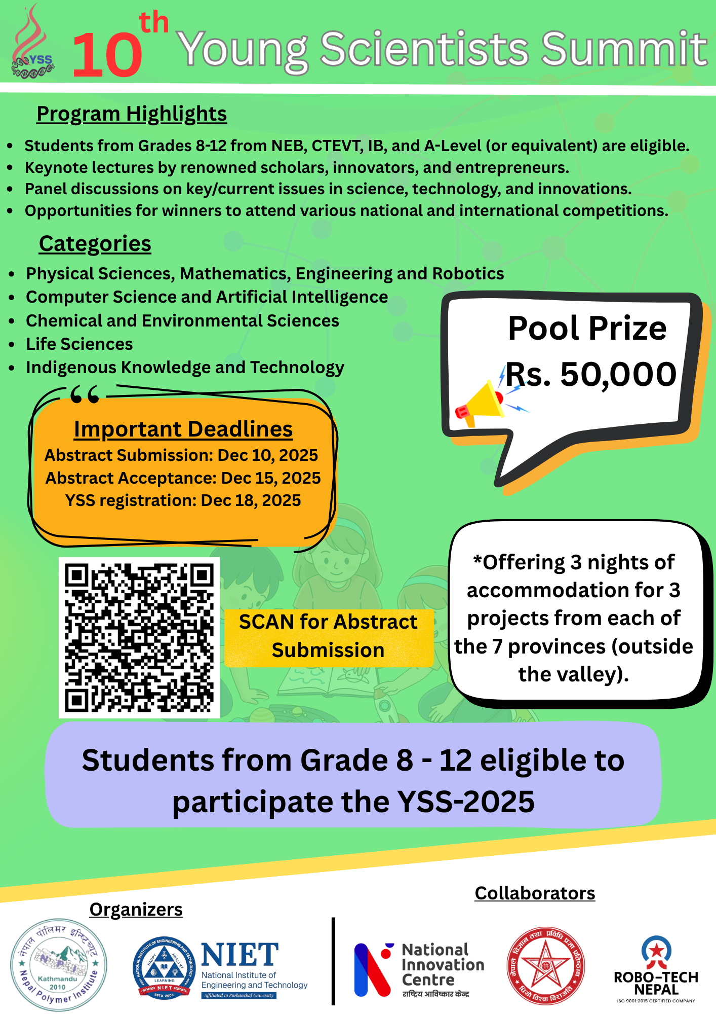 The Young Scientists Summit (YSS) is a flagship initiative of the Nepal Polymer Institute (NPI), Kathmandu, Nepal, a national adhering organization of IUPAC. It serves as a national-level platform that brings together enthusiastic youths from across the country to foster their involvement in scientific and technological development. The summit aims to inspire and empower young researchers, scientists, and students by encouraging them to share their research ideas, innovative projects, and aspirations that contribute to national progress. It is dedicated to recognizing the talent of Nepalese youth and promoting their role in building a prosperous future through science, technology, and innovation. The motto of YSS is “Youth's participation for the prosperity of the nation through science, technology, and innovation.” It is dedicated to recognizing the talent of Nepalese youth and promoting their role in building a prosperous future through science, technology, and innovation.