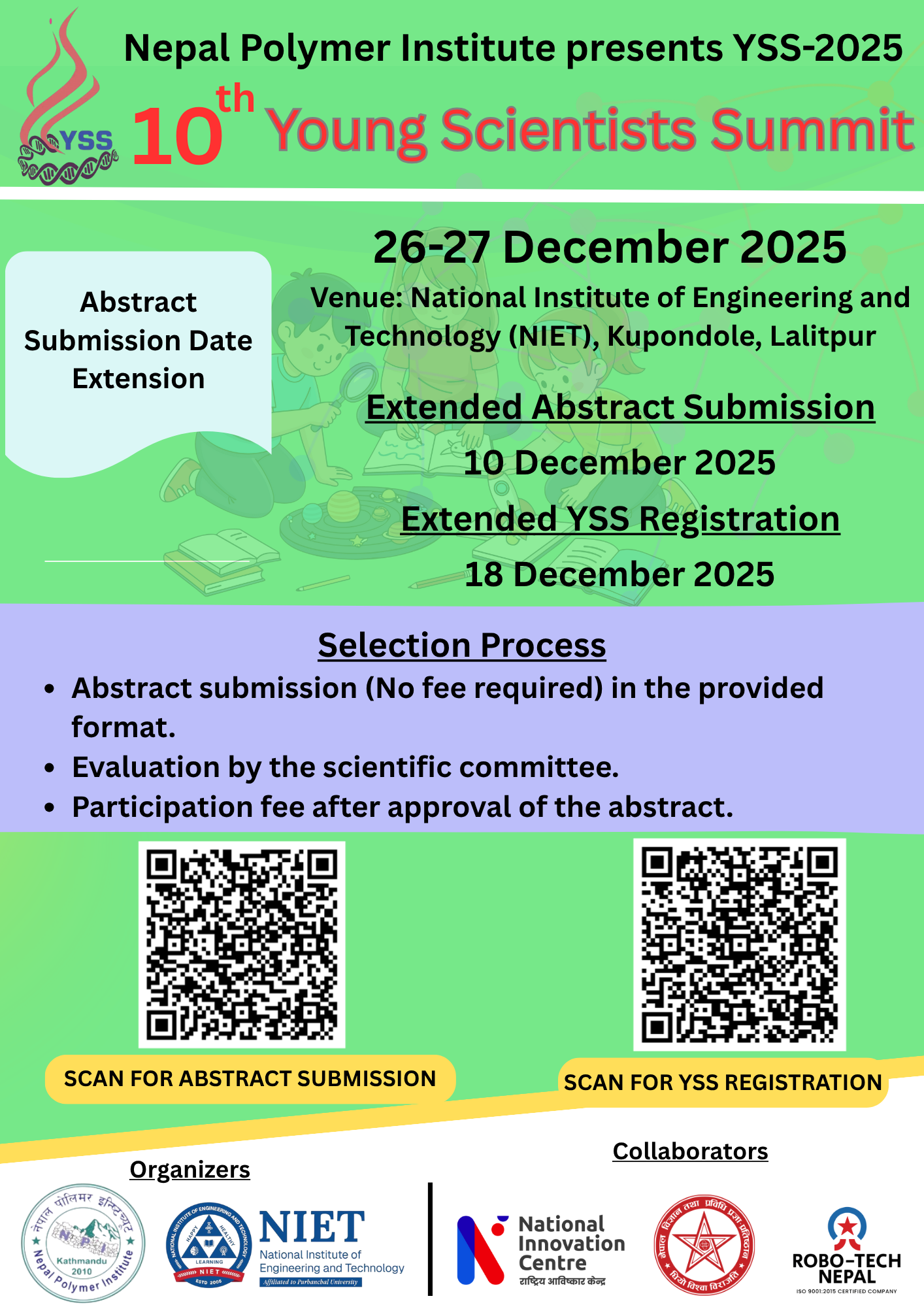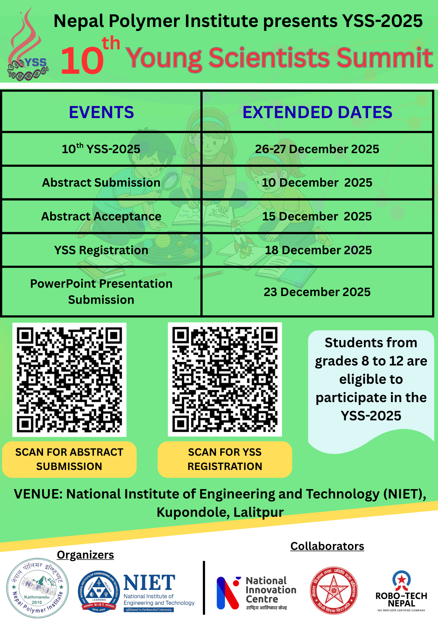 The Young Scientists Summit (YSS) is a flagship initiative of the Nepal Polymer Institute (NPI), Kathmandu, Nepal, a national adhering organization of IUPAC. It serves as a national-level platform that brings together enthusiastic youths from across the country to foster their involvement in scientific and technological development. The summit aims to inspire and empower young researchers, scientists, and students by encouraging them to share their research ideas, innovative projects, and aspirations that contribute to national progress. It is dedicated to recognizing the talent of Nepalese youth and promoting their role in building a prosperous future through science, technology, and innovation. The motto of YSS is “Youth's participation for the prosperity of the nation through science, technology, and innovation.” It is dedicated to recognizing the talent of Nepalese youth and promoting their role in building a prosperous future through science, technology, and innovation.